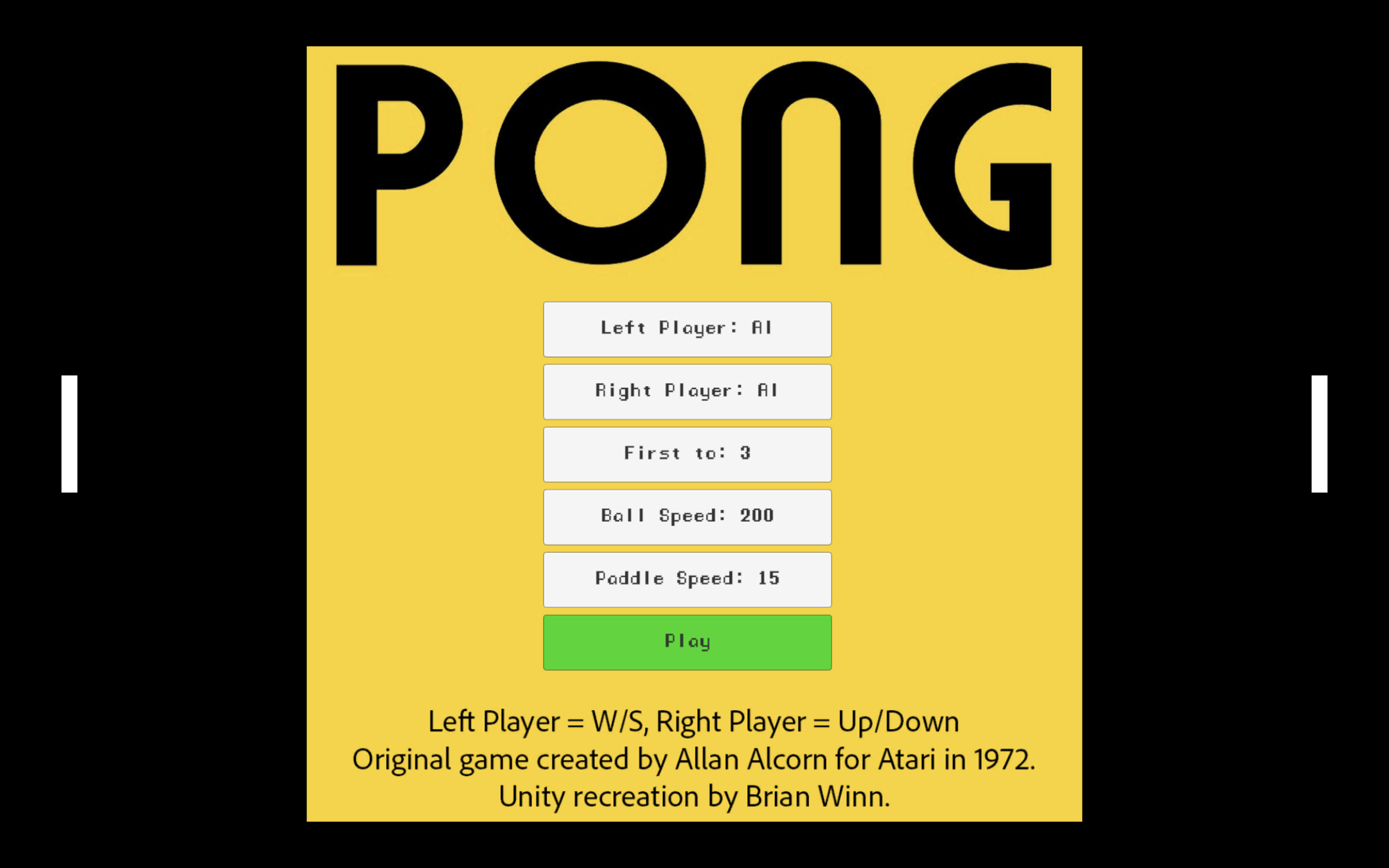 You can play 0-2 players with AI players. You can adjust the ball and paddle speed, as well as the win conditions. Enjoy...